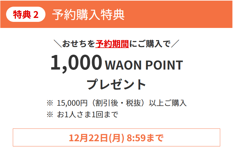 イオンでは、例年11月28日までに予約すると早得5%OFFが適用され、加えて1,000WAON POINTがプレゼント(12月22日まで)されます。