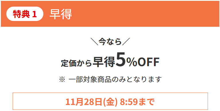 11月28日までの予約がもっともお得で、5%OFF、WAON POINTも忘れずに活用しましょう。