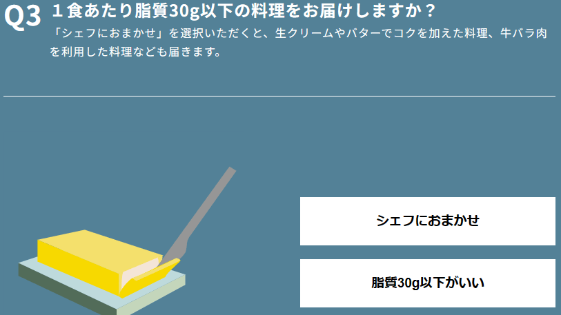 | 味 | 和洋中ともに高レベルの味付け | 低糖質にしてはしっかりとした味付 | 外食と変わりのない味付 | ダシにこだわり味がしっかりしている | ダイエット、バルクアップコースで異なる | 高タンパク、低カロリーの割にしっかり | 和洋中から塩分、糖質、やわらかい食事まで |