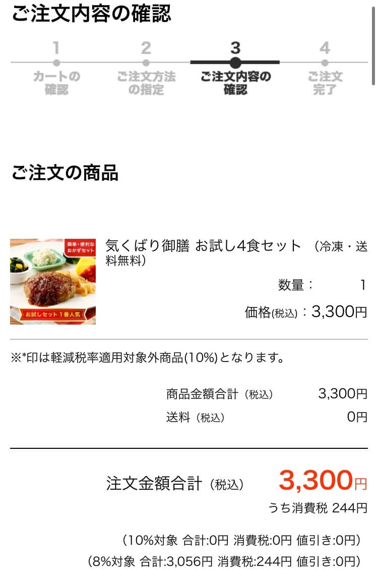 送料込みの3,300円で購入できているかを確認します。本来の送料代は800円のため、お試し4食セットが2,500円で購入できる計算です。1食625円(税込)で食べれるのは初回限定です。