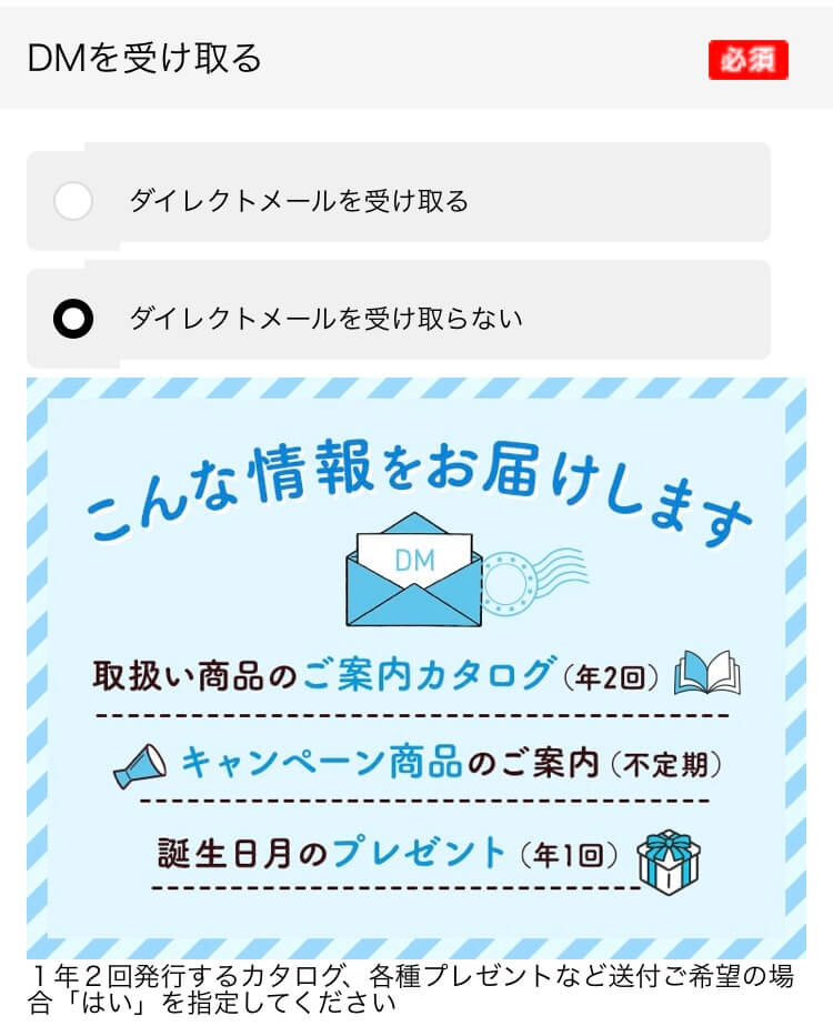 注文が完了したら、DMの受取りの有無が選択できますが、ダイレクトメールは受け取るようにした方がいいです。年2回の商品カタログが届きますし、誕生日月にプレゼントが貰えます。