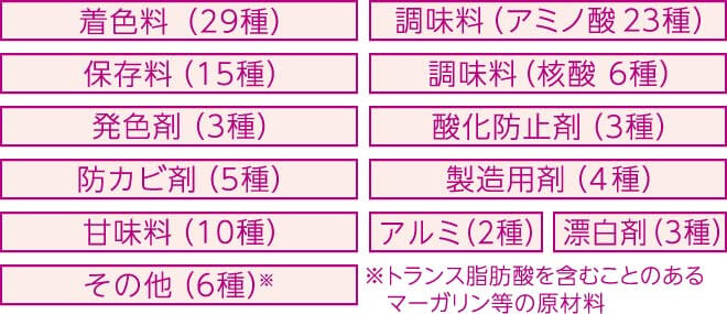 - 保存料・着色料・化学調味料など109種類の添加物に配慮