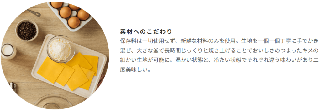 使用する卵、小麦粉、砂糖などは厳選されたものばかりで、添加物を極力抑えたシンプルなレシピは、毎日食べても飽きないと評判です。