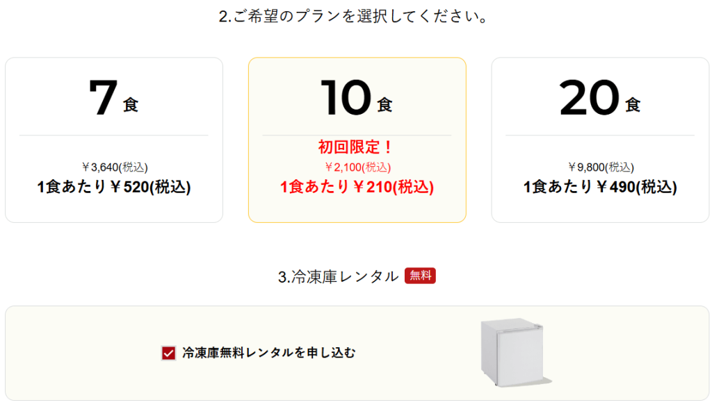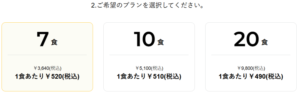| 定期コース | ・スタートプラン7食 ・ノーマルプラン10食 ・アドバンスプラン20食 |