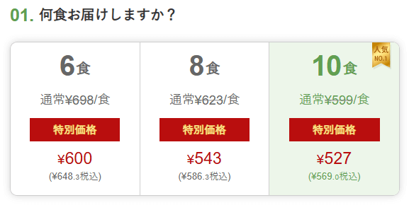 | 料金(1食あたり) | ・6食(698円) ・8食(624円) ・10食(599円) ・20食(599円) |