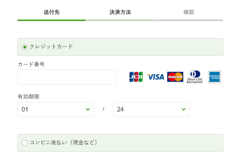 | 支払い方法 | クレジットカード、後払い(コンビニ) |