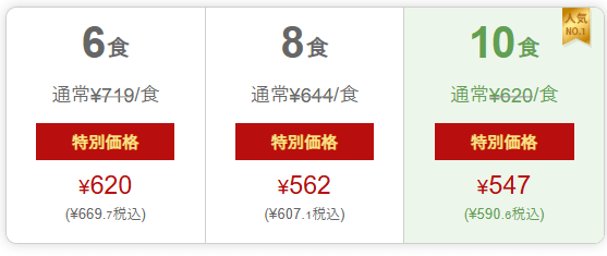 10食プランで1食あたり620円。 初回は1食547円とお得です。
