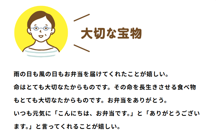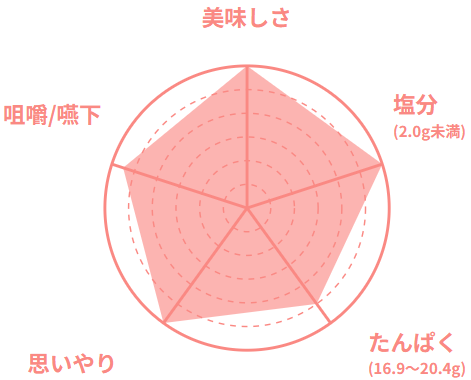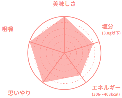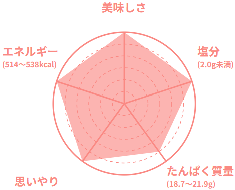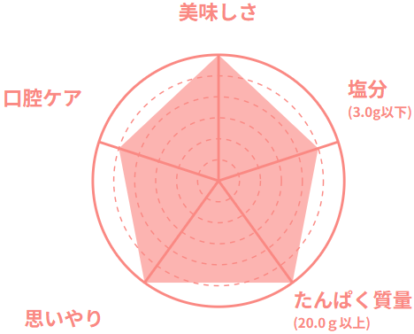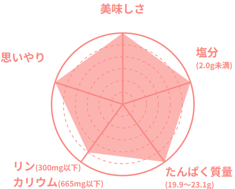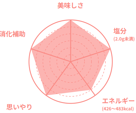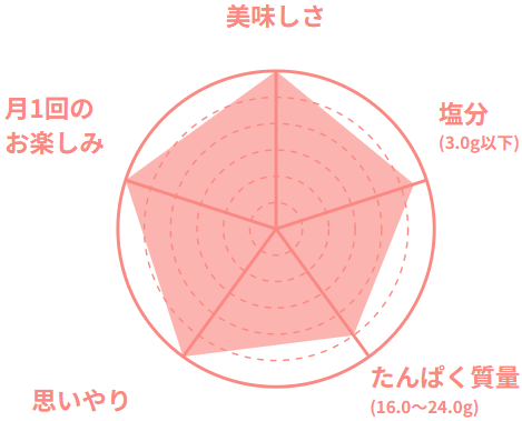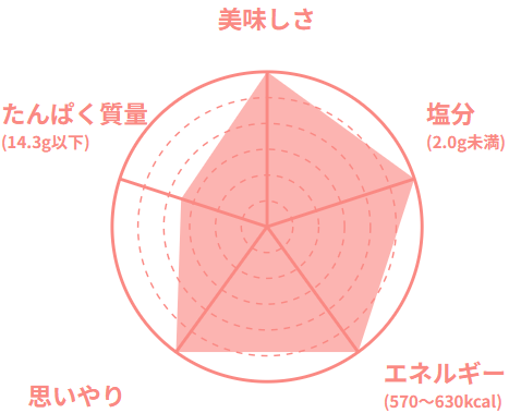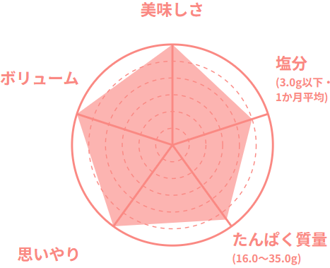 専属の管理栄養士が70歳以上の在宅のご高齢者の方を想定した栄養基準で、食べ残さない、ちょうどいい量目で食感、大きさ、味付けに工夫をしています。容器も軽く、食べやすさ、開けやすさなども工夫をしています。