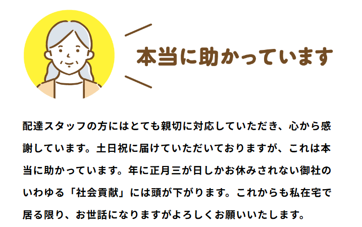 時間指定は受け付けていません。昼食は12時まで、夕食は18時までにお届けされています。