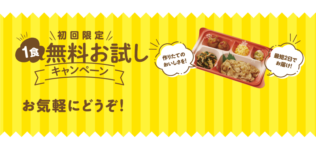 いきなり始めるのは不安というかたのための特別なキャンペーンです。初回は1食無料で食べられます。もちろん送料も無料です。お得な機会に試してみましょう。