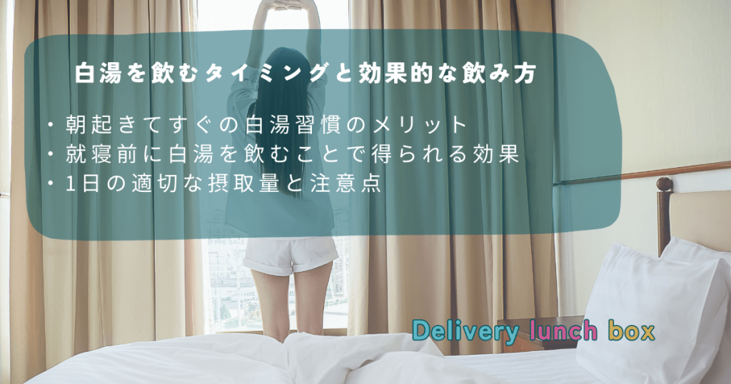 白湯は、朝起床後や夜寝る前に飲むのが効果的とされています。 朝は体を目覚めさせ、夜はリラックス効果を高めるために適しています。