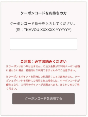 クーポンコードは前後や途中にスペースがあると無効になります。貼り付け後に余分な空白や改行が入っていないか、必ずご確認ください。