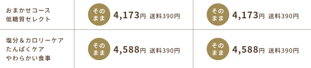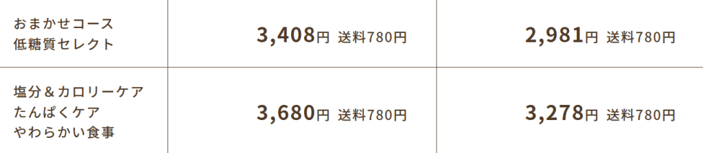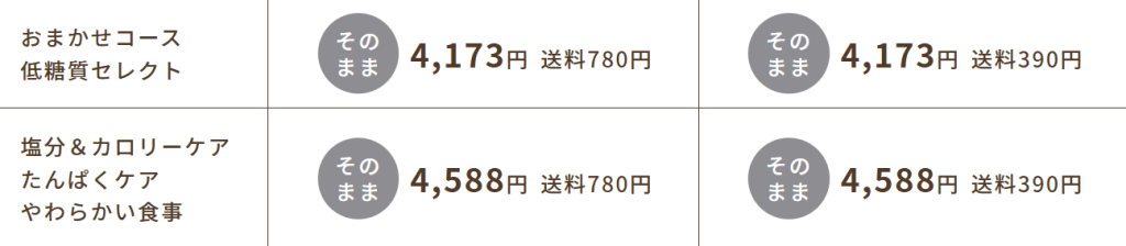 「塩分&カロリーケア」「たんぱくケア」「やわらかい食事」の3コースは定期便の方が952円お得となっています♪