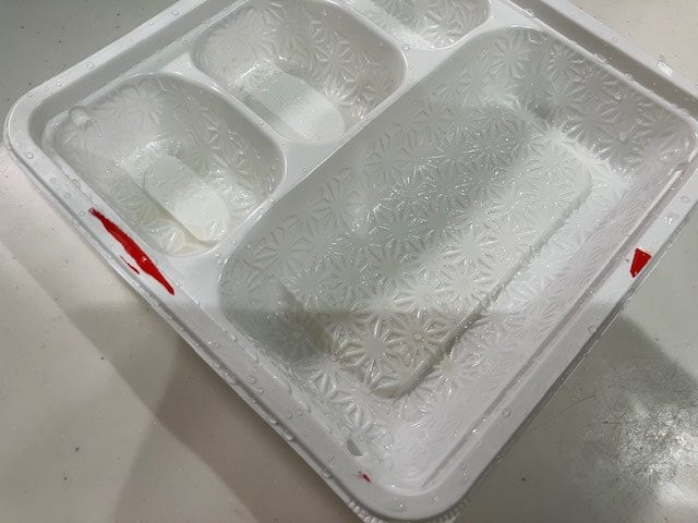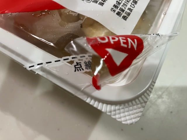 点線部分よりお弁当を開けようとしたのですが、2つのお弁当は綺麗に開けることができず、中途半端な結果に!