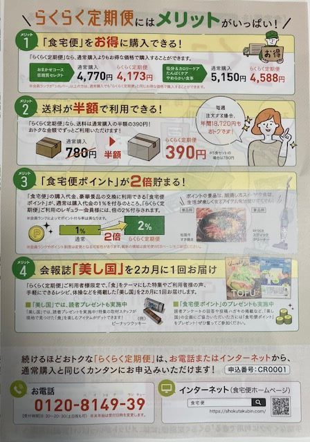通常購入から「らくらく定期便」に変更したい場合や食宅便を「解約」したい場合はお電話にて受け付けているので連絡しましょう♪