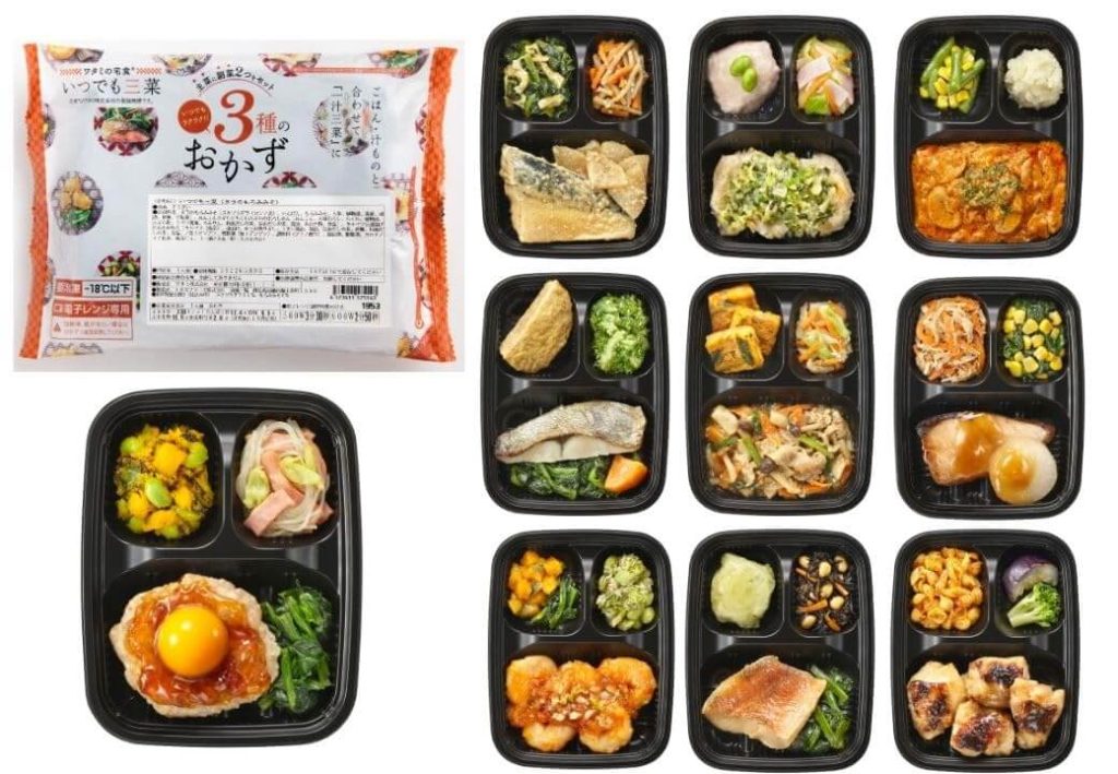 いつでも三菜の3品入りで1食約250kcal。いつでも五菜の5品入りで約350kcal。たくさん食べたい方はいつでも五菜を選びましょう。